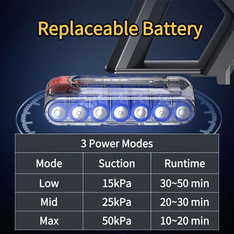 Equipped with a removable rechargeable battery, this vacuum provides up to 50 minutes of continuous runtime, allowing you to clean entire homes, vehicles, and furniture without interruption. Ideal for tackling pet hair, carpets, hardwood floors, and upholstery β itβs a premium combination of power, technology, and convenience.